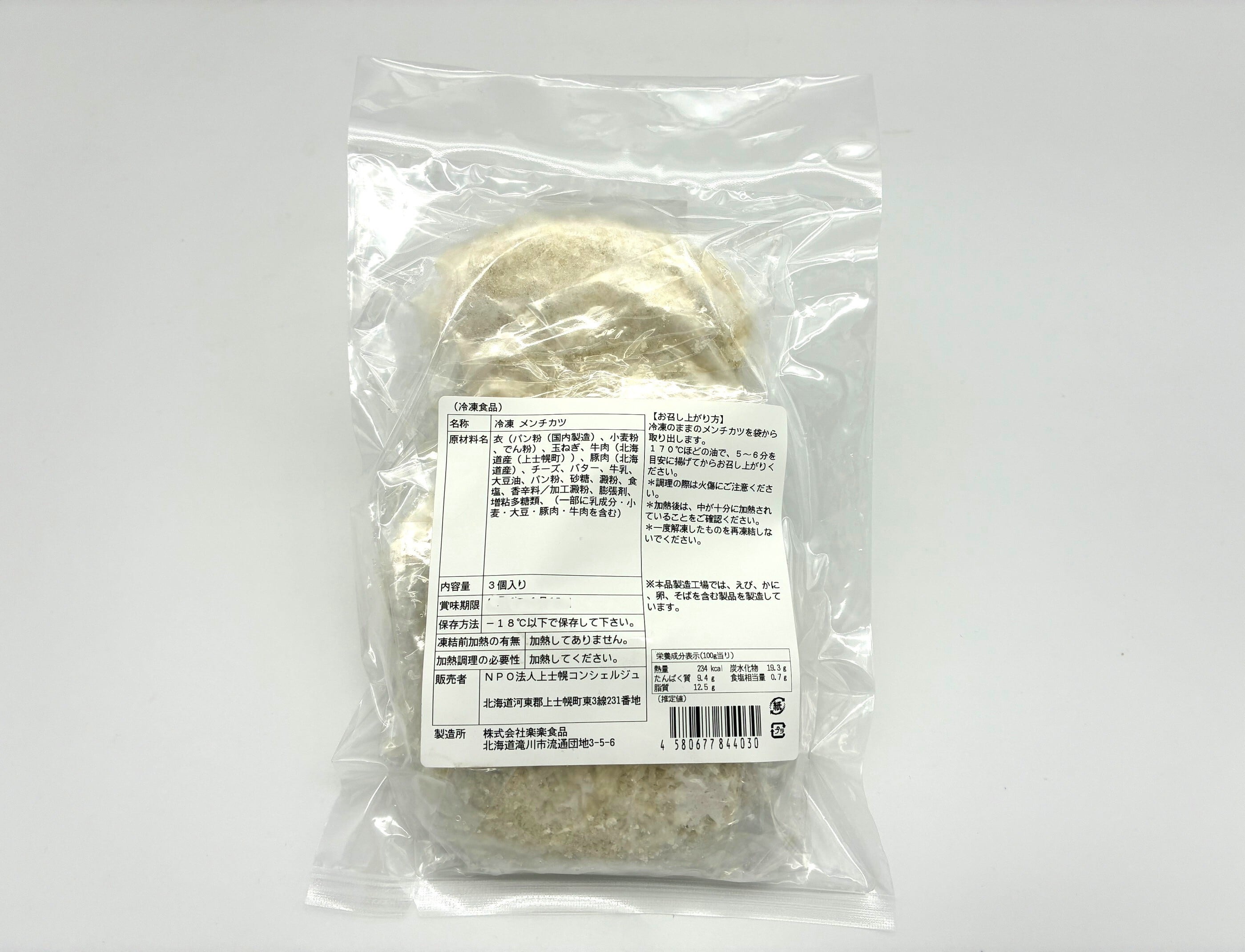 衣(パン粉(国内製造)、小麦粉、でん粉)、玉ねぎ、牛肉(北海道産(上士幌町)、豚肉(北海道産)、チーズ、バター、牛乳、大豆油、パン粉、砂糖、澱粉、食塩、香辛料/加工澱粉、膨張剤、増粘多糖類、(一部に乳成分・小麦・大豆・豚肉・牛肉を含む)